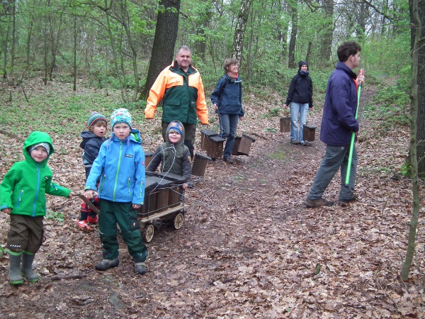 Endlich war es soweit. Am Ostersamstag trafen wir uns am Collm mit dem Förster Herrn Erdmann vom Sachsenforst und Olaf Schmidt von der Fachgruppe Ornithologie zum Aufhängen der Nistkästen. Eltern, Großeltern und Geschwister halfen uns und so hatten wir bald alle Kästen aufgehängt. Über unsere Arbeit freuten wir uns bei einem gemeinsamen Picknick auf dem Collmberg und zum Abschluss gingen wir noch alle auf den Turm und bewunderten die Aussicht. Danke an alle Helfer. Im Mai wollen wir die kästen kontrollieren und vielleicht sind ja wirklich Siebenschläfer eingezogen. Wir würden uns freuen.